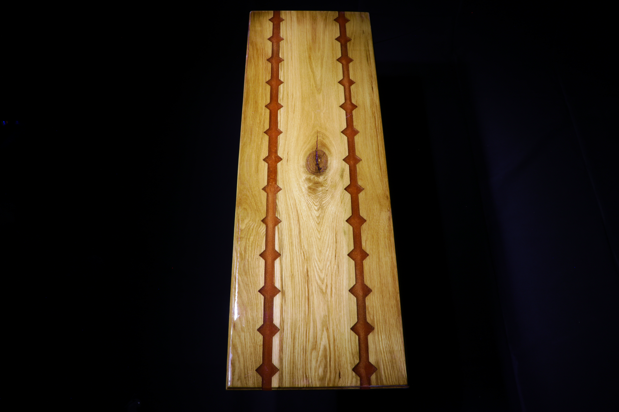 This bench is made of red oak with a geometric design running its length. The pattern is filled with a copper colored pearlescent resin.