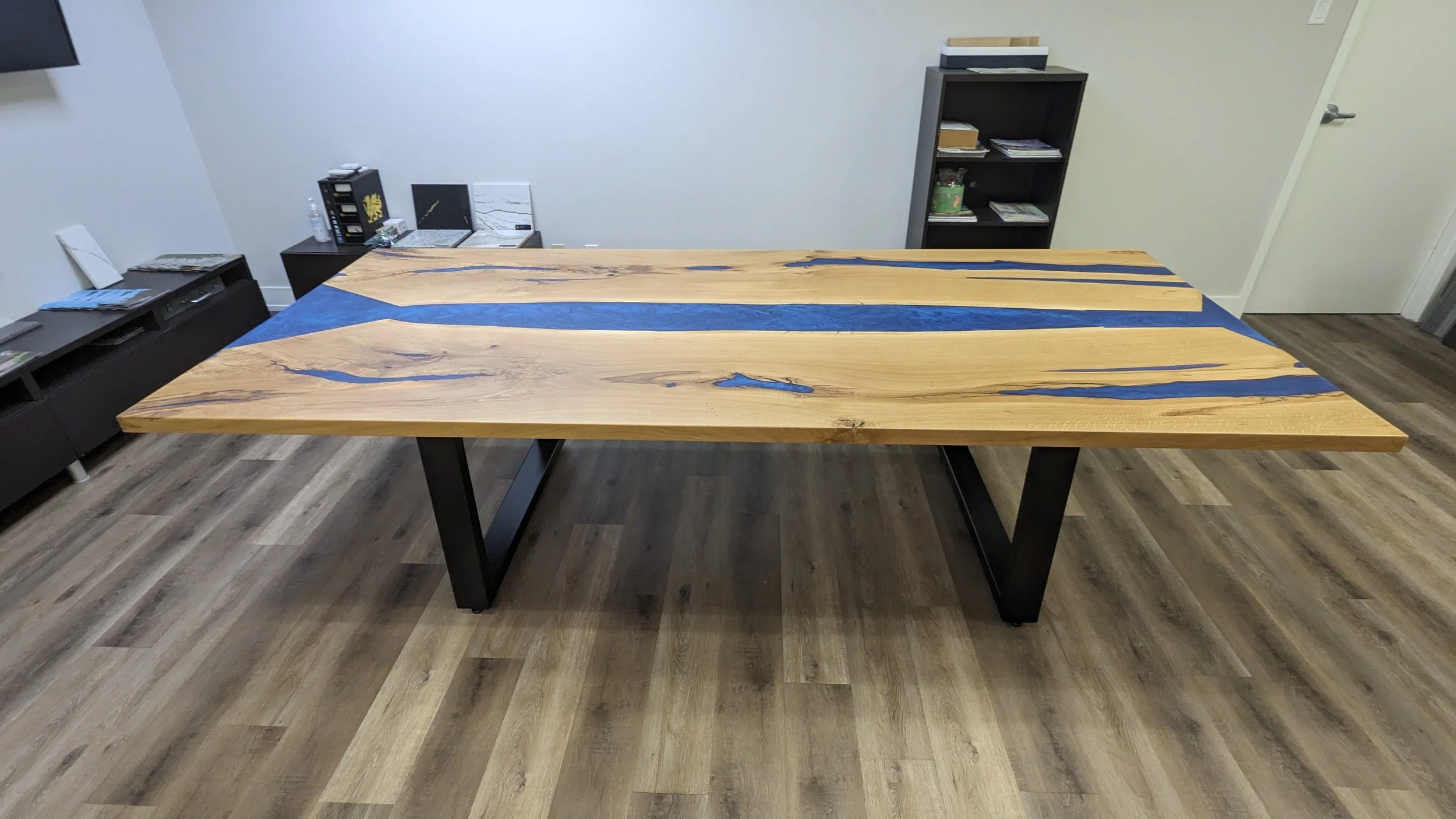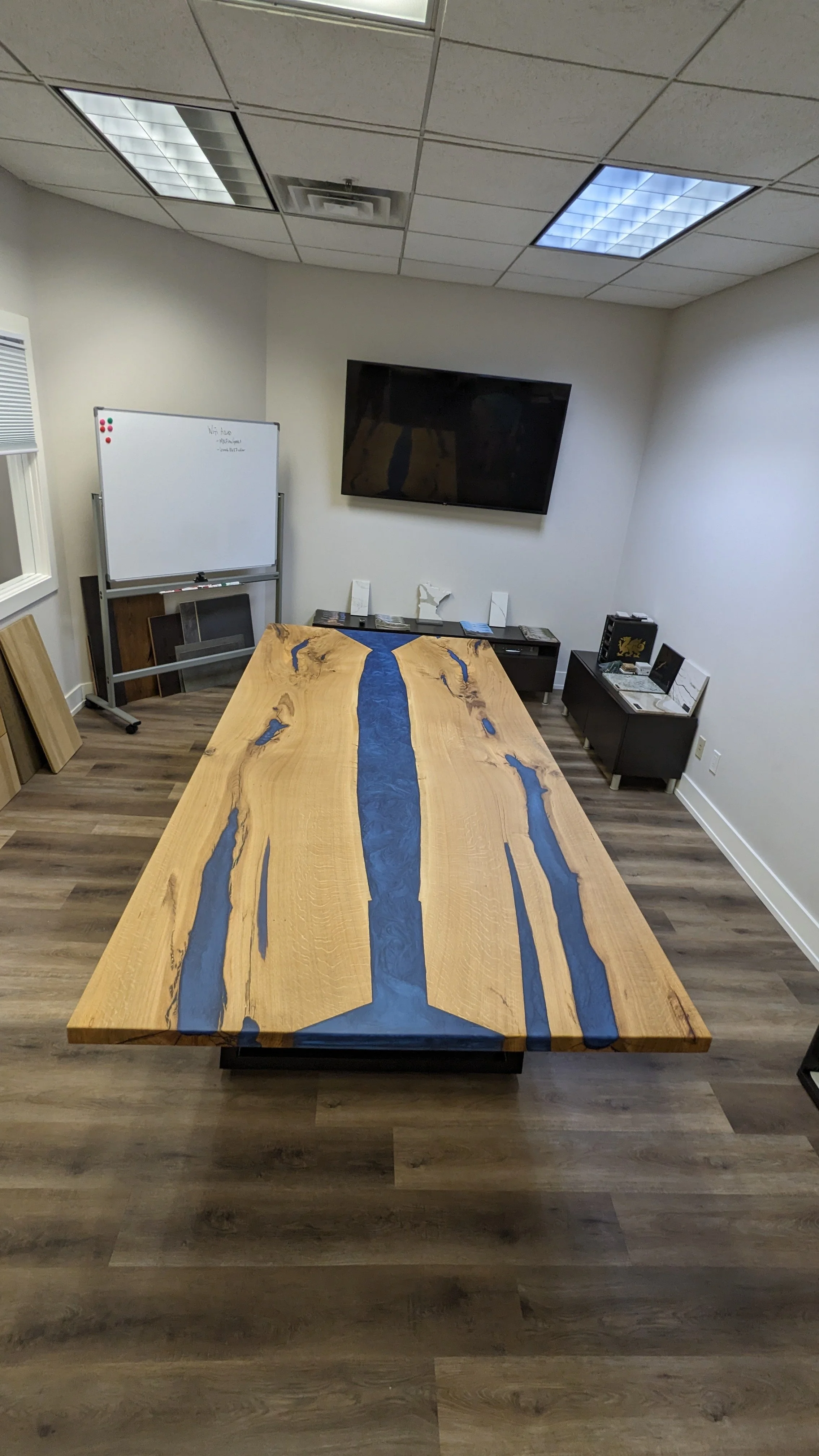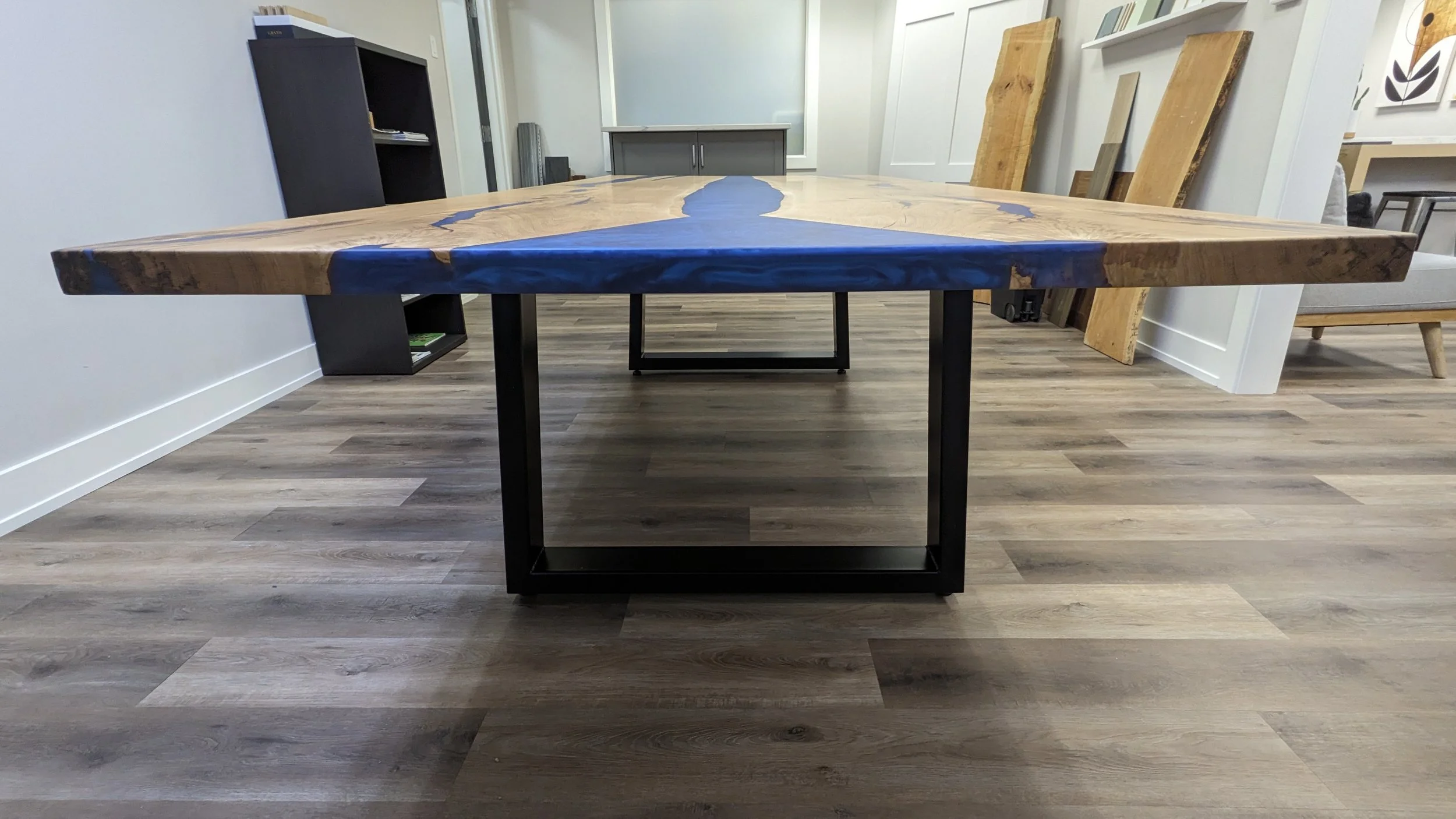 This conference table is made from book matched slabs of white oak with a deep blue resin river run the length of the table. The base is made from two matte black steel legs to add a modern look and feel to the table.