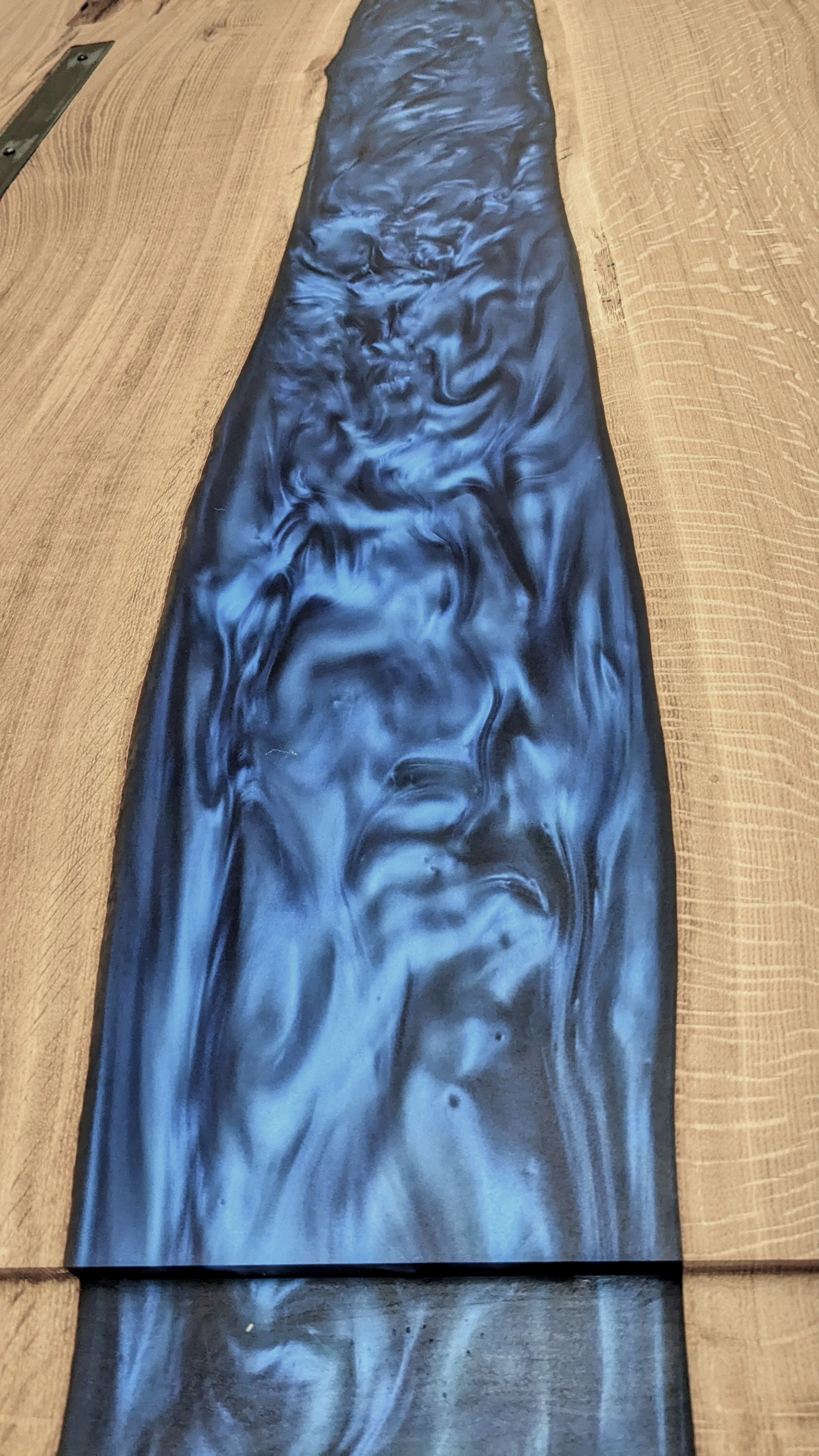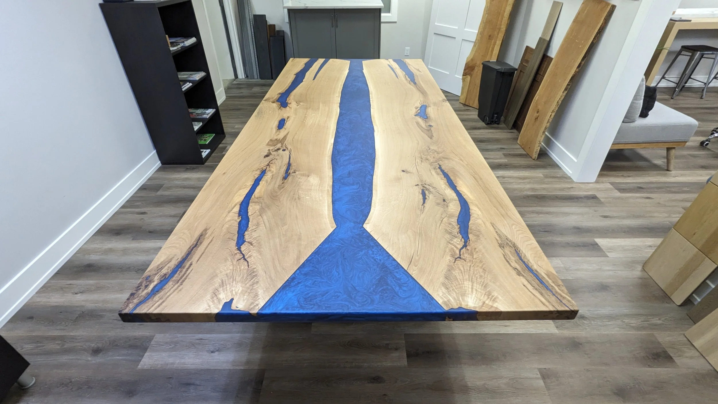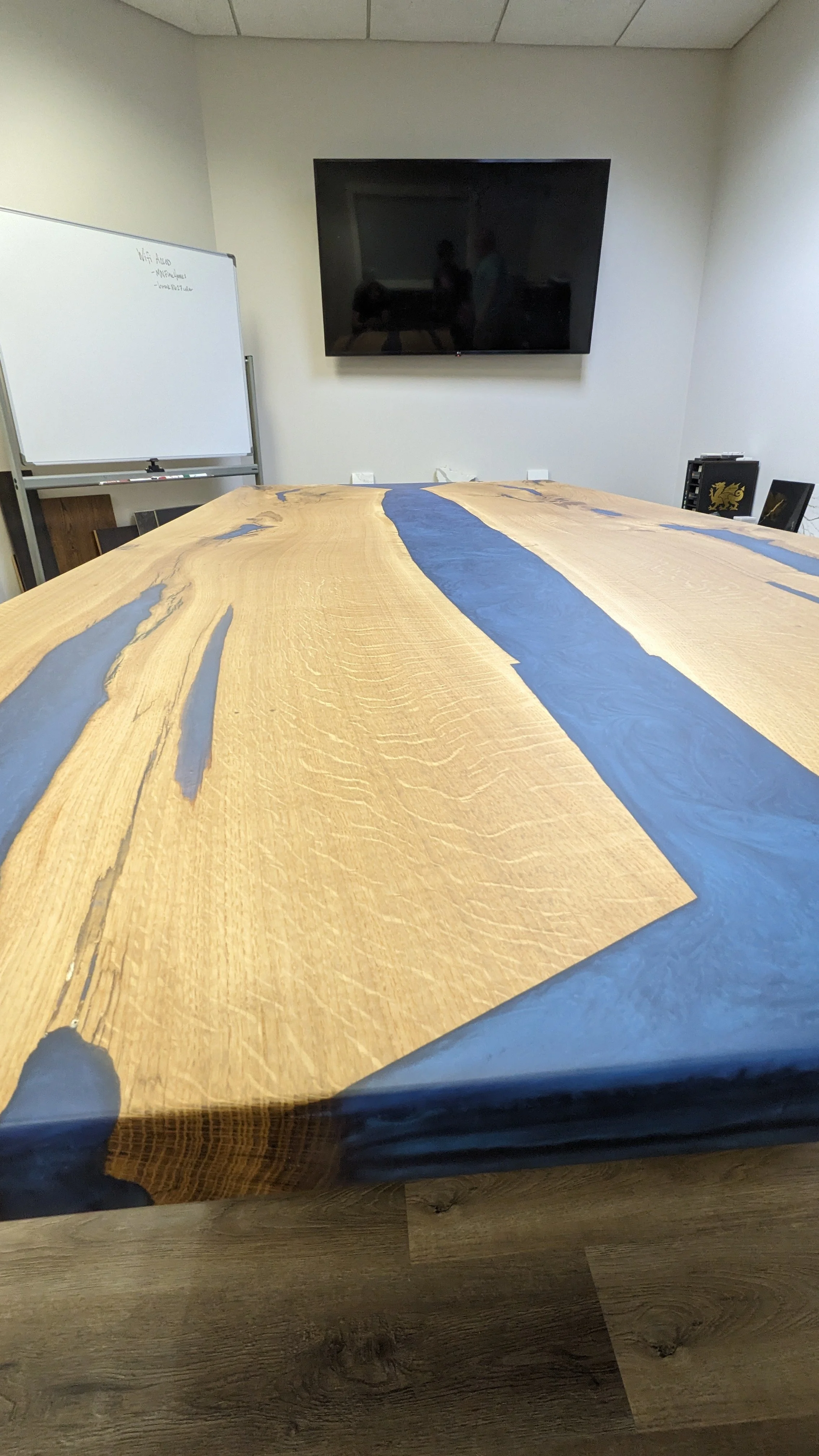 This conference table is made from book matched slabs of white oak with a deep blue resin river run the length of the table. The base is made from two matte black steel legs to add a modern look and feel to the table.