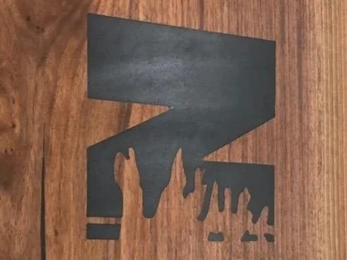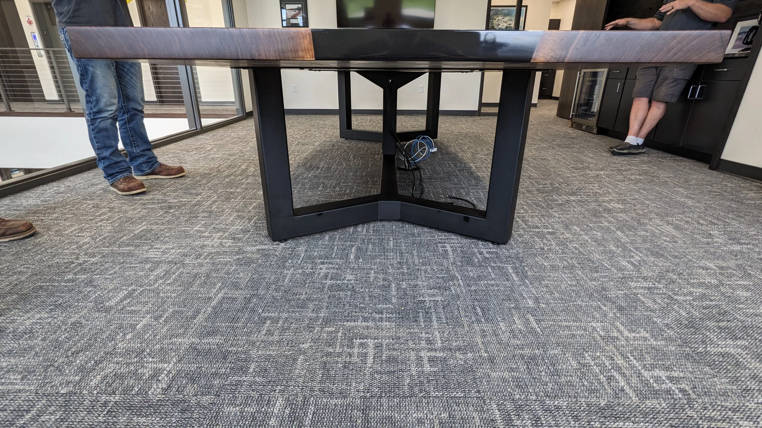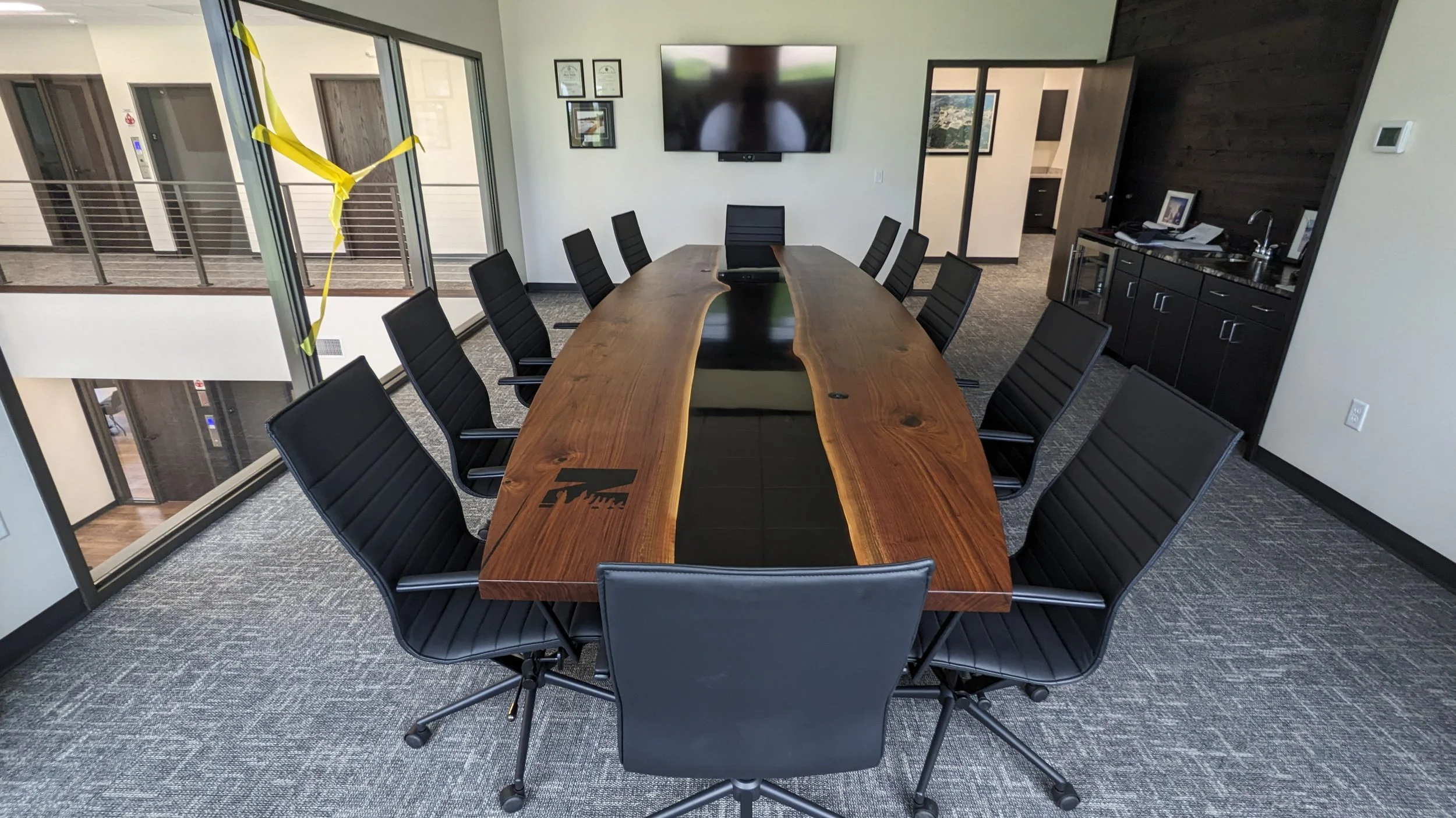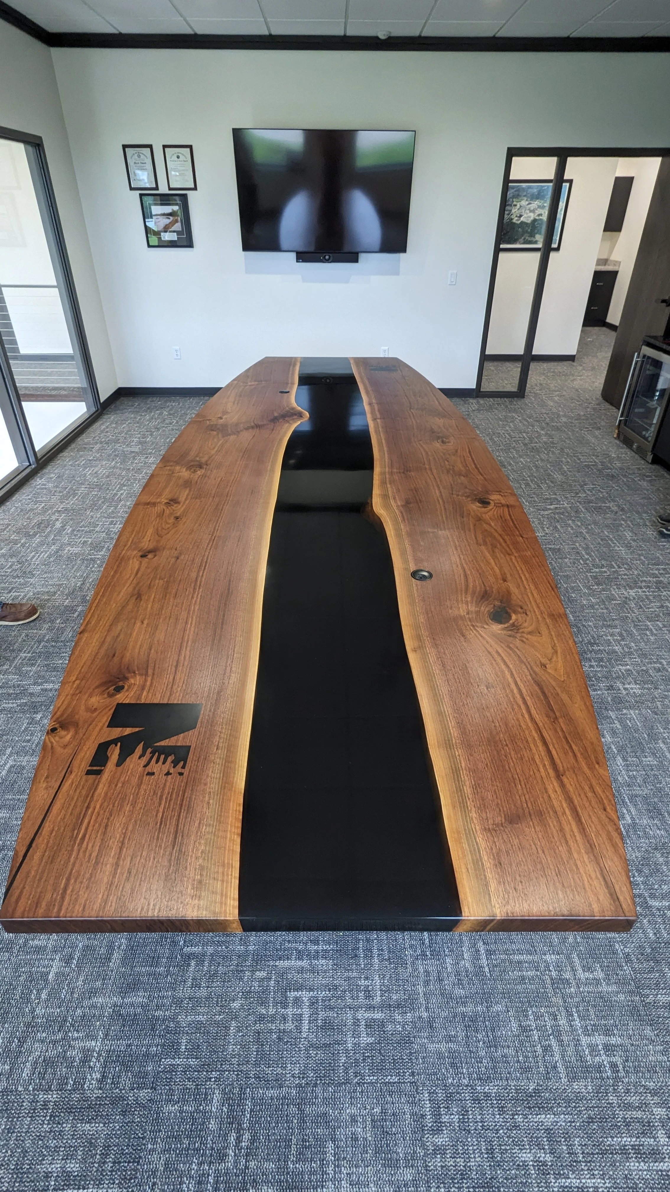 This 14’ x 5’ conference table is made from solid black walnut slabs. The resin river has a black base layer with clear epoxy fill to reveal the live edge slabs shape and contours. The logos are engraved into each slab and filled with a pure black resin. The metal base was custom designed to provide proper support and functionality for the table.